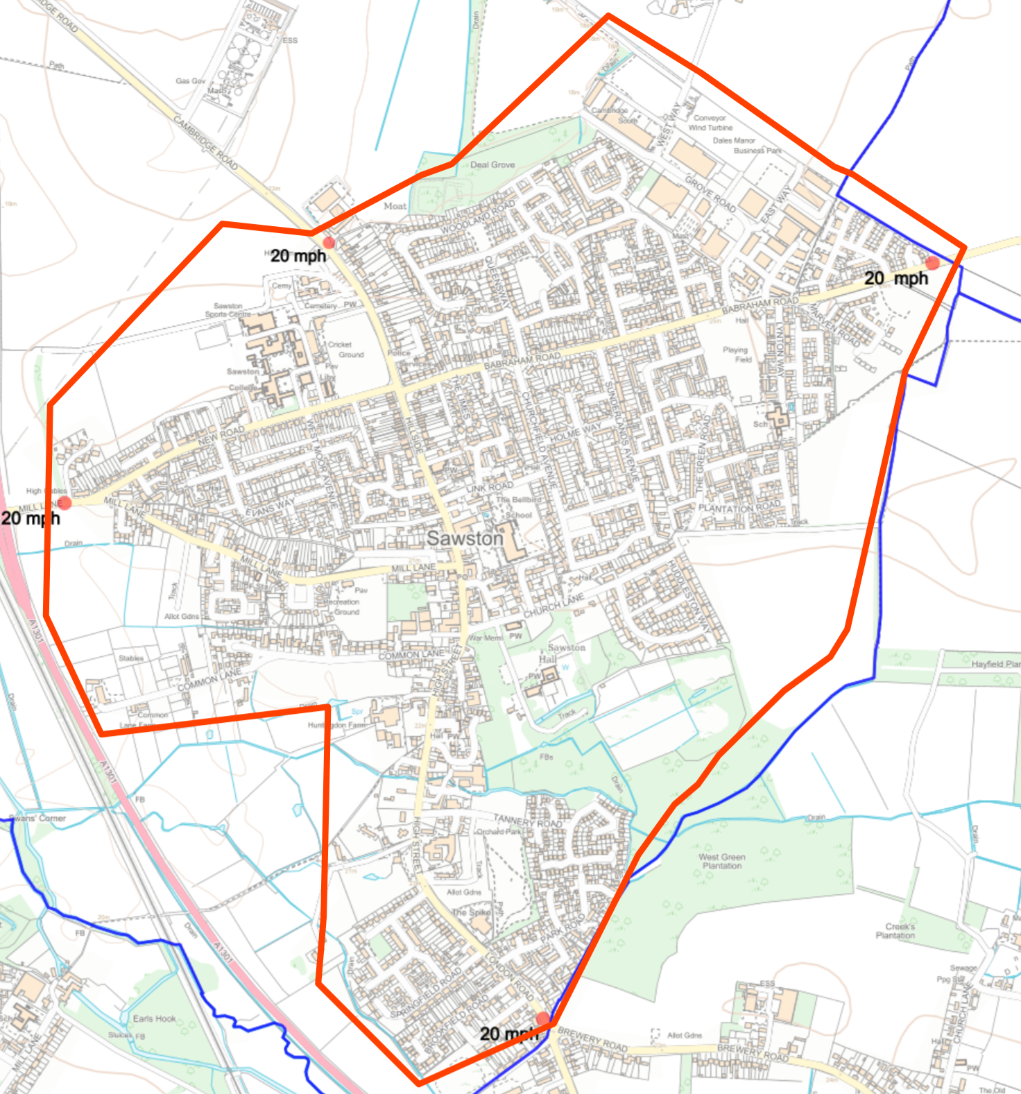 • Cambridgeshire County Council provide funding every year for Parish Councils to apply to introduce 20mph speed limits for roads where this would be a benefit. The primary need is to protect New Road where 1400 children go to Sawston Village College every day – many using bicycles and lifts in cars at the same time as competing with HGV vehicles and six buses bringing pupils from neighbouring villages – but the same protection should apply to all the other roads within the central core area of Sawston.