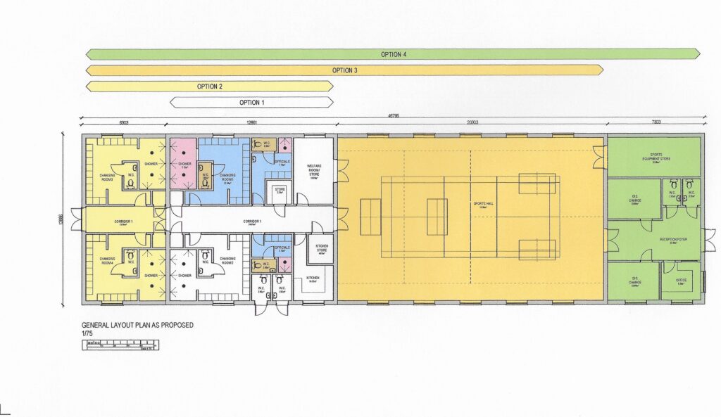 The plans below show a basic outline concept of what we could include. Many features of the new pavilion are fixed as a must have, such as changing rooms and showers for both home and away football teams and facilities for officials, but we would also like to include a larger space that can also be used for meetings and events, as well as facilities for youth groups. We also plan to include more parking spaces.